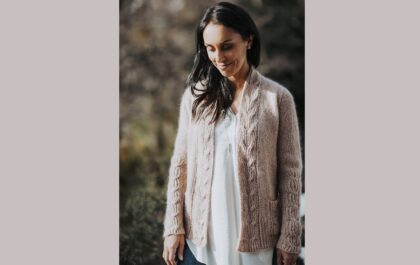 Нежный кардиган с косами в качестве отделки и большими карманами, которые сделают такой кардиган универсальным. Кардиган вяжется сверху вниз одной деталью, что минимизирует необходимую отделку изделия.