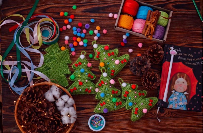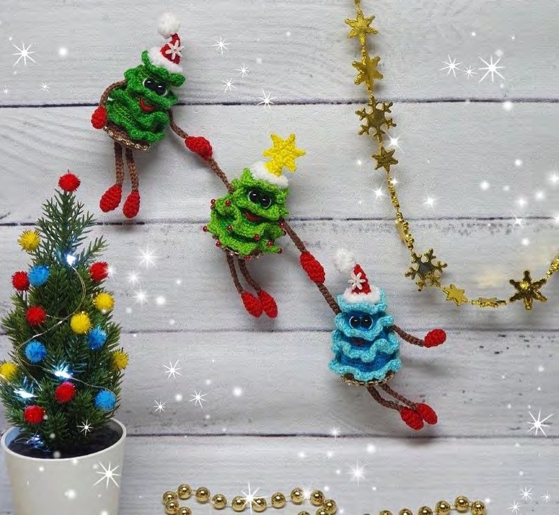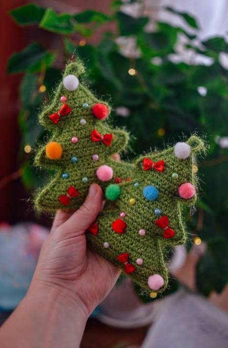 В ходе вязания наполнить ёлочку наполнителем, но совсем немного. Украсить по своему желанию.