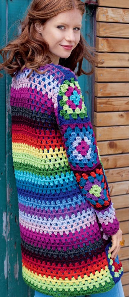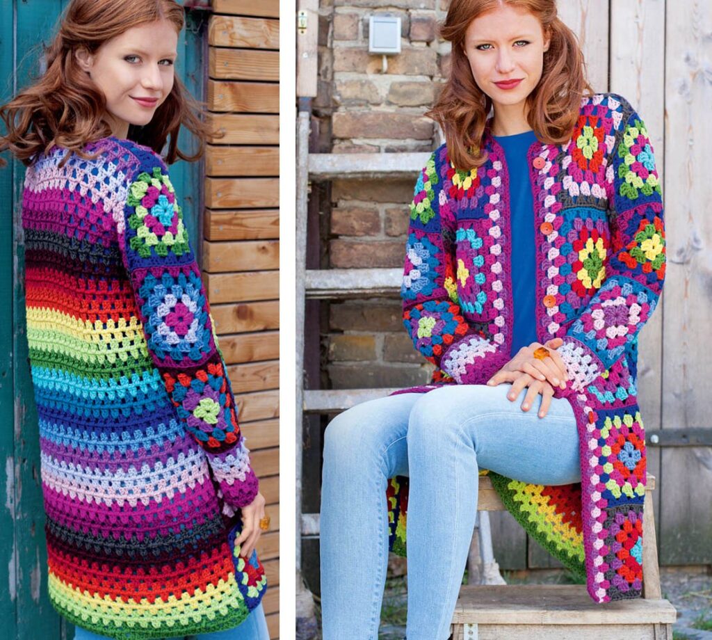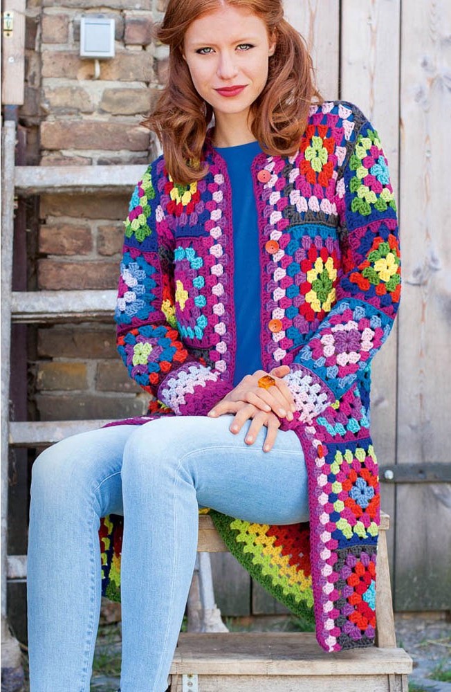 Вы можете связать это пальто и очень ярким, как в предлагаемом варианте, и выбрать более спокойные сочетания цветов.