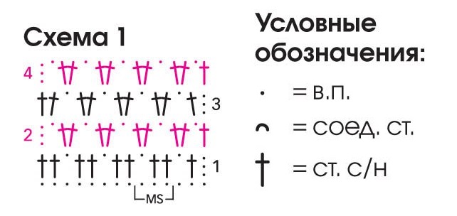 Вязать согл. схеме 2 круговыми рядами. Каждый круговой ряд начать с 3 в.п. вместо 1-го ст. с/н и закончить 1 соед. ст. в 3-ю в.п. замены.