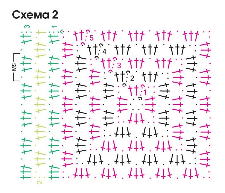 Раппорт = 4 петли. Узор вязать согл. схеме вязания узора крючком 2 (зеленые значки) прямо на краю квадратов. Выполнить 1 раз 1–3-й ряды.