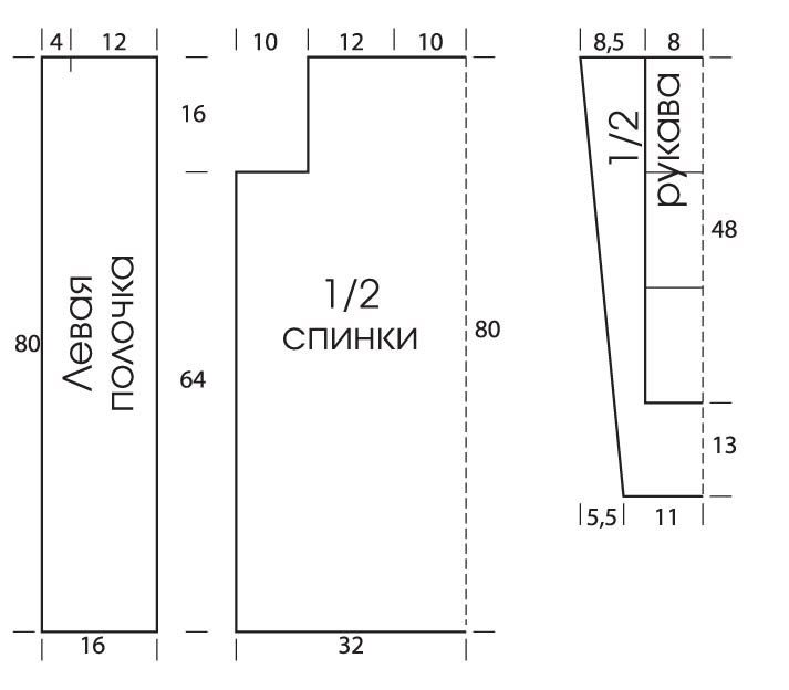 Выполнить плечевые швы с обеих сторон длиной 12 см. Боковые края спинки пришить к нижним 64 см полочек (внешние 5 см проймы спинки теперь относятся к полочкам). Вшить рукава. Выполнить швы рукавов.