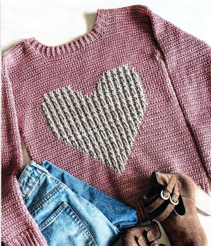 Рельефное сердце на гладком полотне джемпера связано в технике интарсии. Миксуем цвета и узоры.