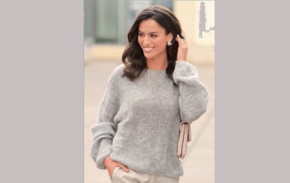 Скромное обаяние этого повседневного пуловера, связанного в две нити, обусловлено благородным светло-серым оттенком, приятной смесовой пряжей с шерстью альпака и несложным рельефным узором. Открытые швы выглядят актуально, эффектно и отлично вписываются в лаконичный прямолинейный дизайн.