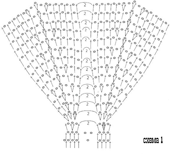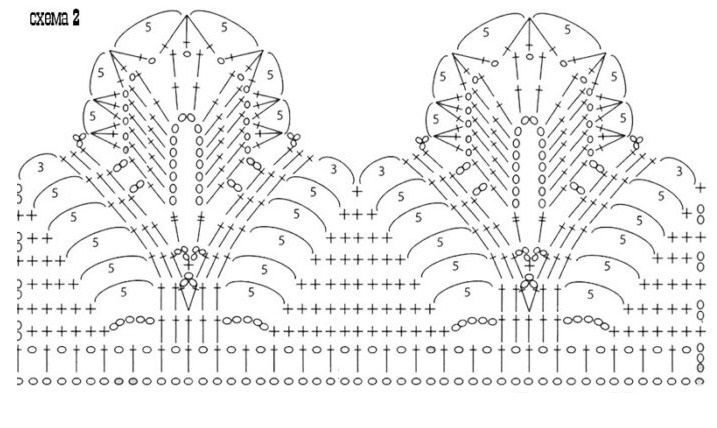По линии выреза горловины провяжите 5 рядов СБН, после чего выполните кайму по схеме 2.