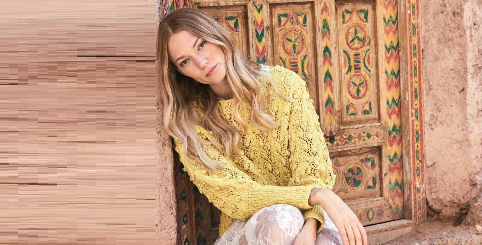 Ажурный пуловер с высокими планками в резинку связан завораживающим ажурным узором из шишечек из 100% хлопка желтого цвета.