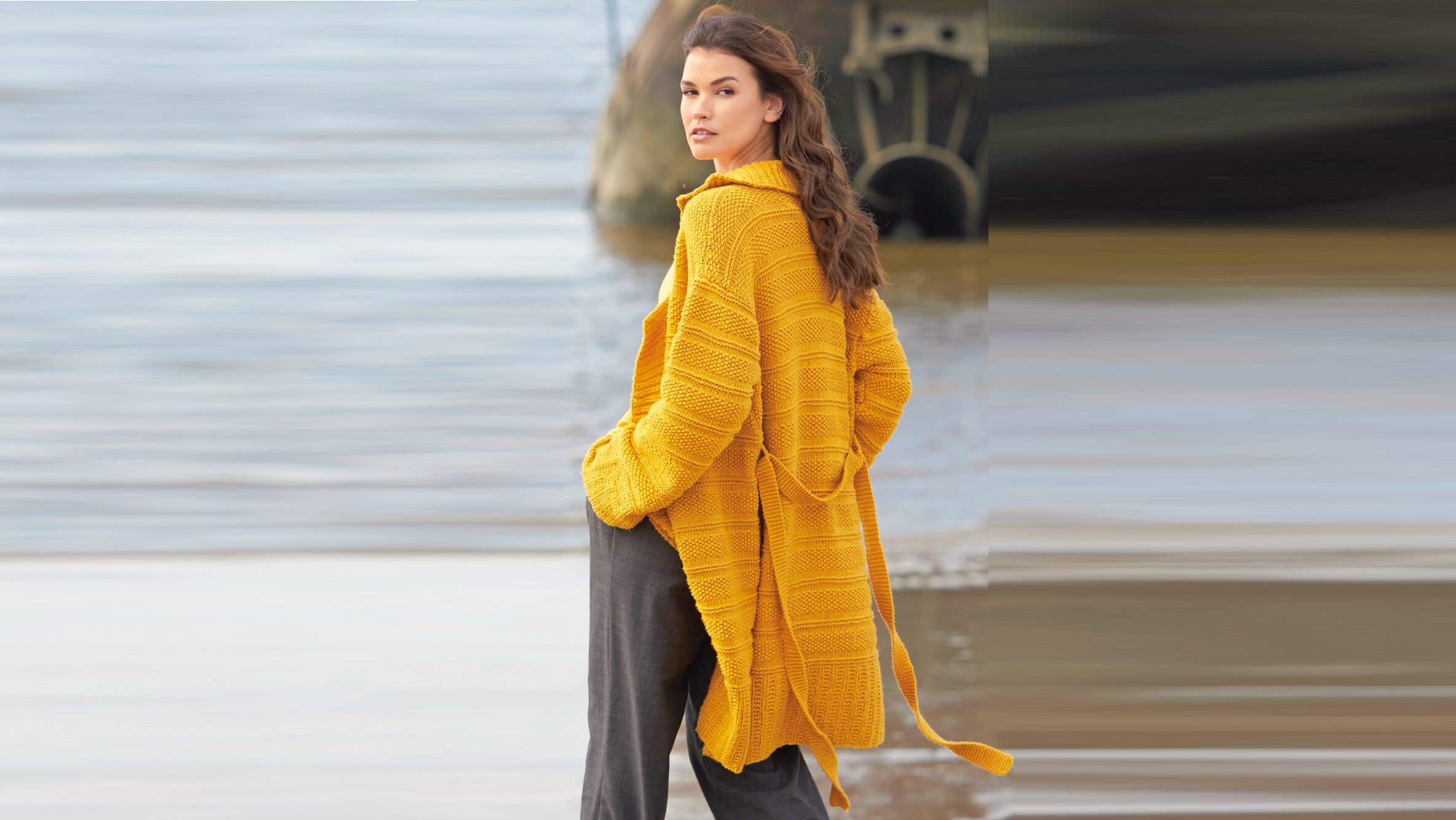 Stylish and comfortable! A long jacket made of ocher wick yarn can be worn open or wrapped and tied at the waist with a belt. The front panels fold down at the top to form collar lapels.