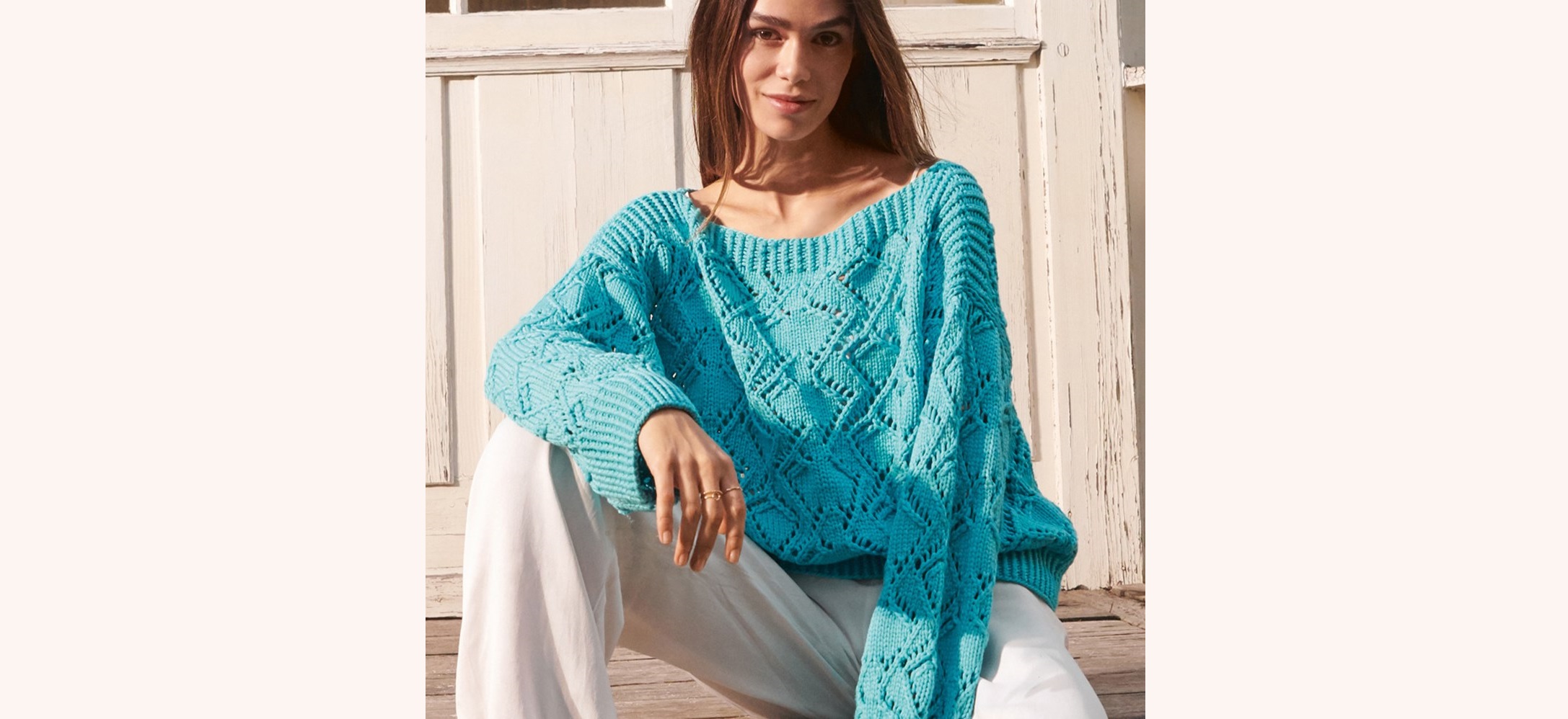 Бирюзовый пуловер оверсайз с фантазийным ажуром