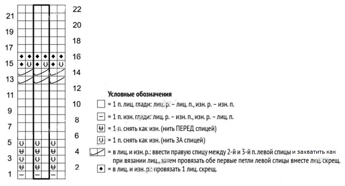 Main pattern: (четное число петель) вязать по схеме, на которой приведены лиц. и изн. ряды. Обратить внимание на разное значение символов для лиц. и изн. рядов! В ширину 2 п. раппорта постоянно повторять. В высоту 1–22 р. постоянно повторять. Если из-за прибавлений или убавлений раппорты на краях не будут входить полностью, провязывать эти петли лиц. гладью.