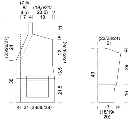 Пришить посередине полочек карманы, отступив 4 см от нижнего края.