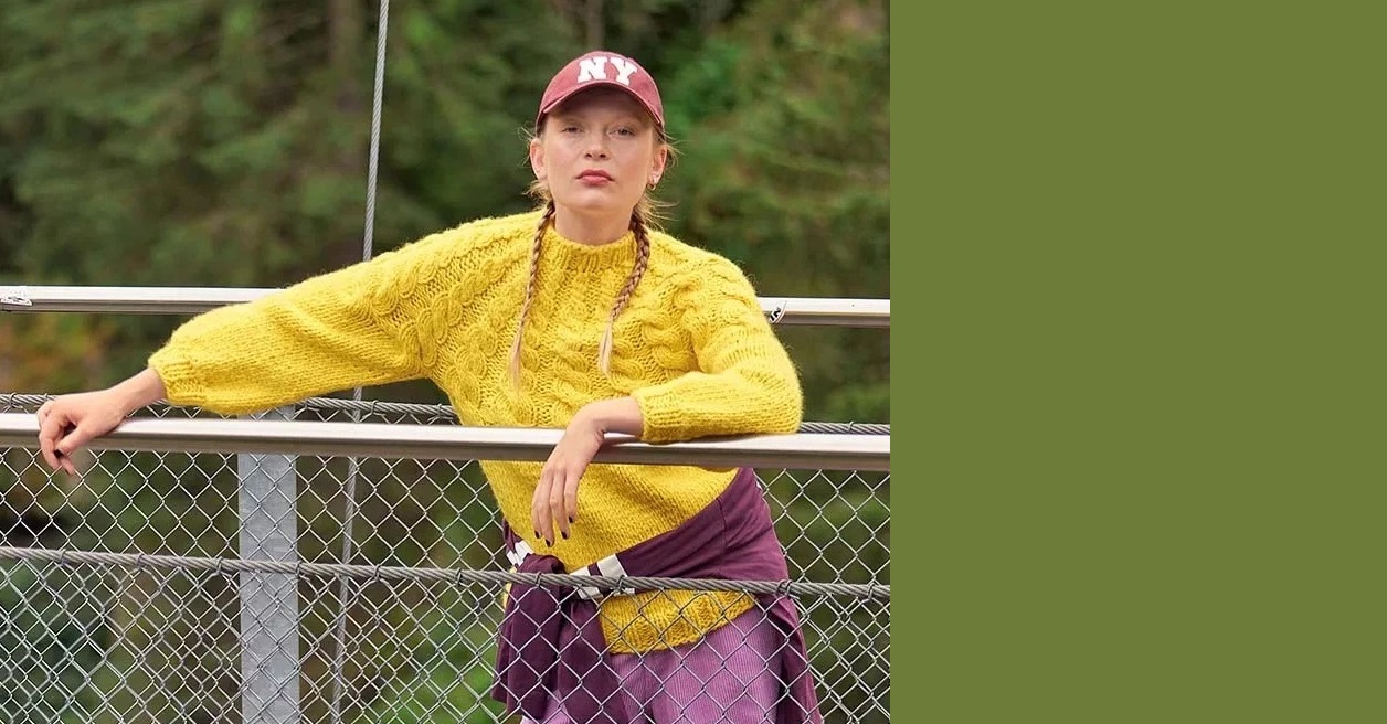 Больше объема и больше позитива! Вот девиз ярко-желтого пуловера из смеси шерсти овцы и альпака. Работа начинается с резинки и лицевой глади, а затем на круговых спицах выполняется кокетка с «косами», которые, словно солнечные лучи, расходятся от горловины.