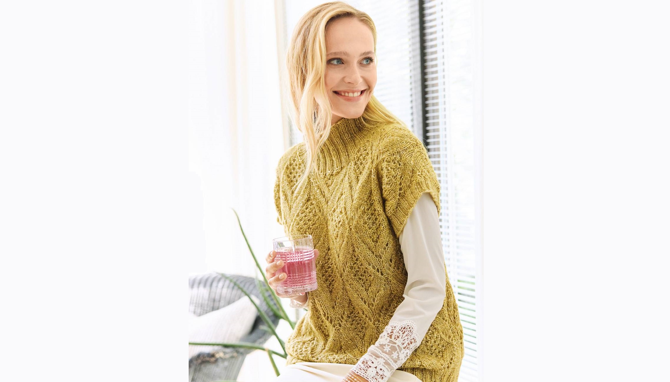 Этот роскошный жилет, связанный объемной пряжей с мерцающим эффектом, приковывает взгляды. Ажурный узор в виде ромбов создает изысканную игру текстур и делает образ воздушным. Модель дополнена аккуратной отделкой горловины, пройм и низа резинкой, которая обеспечивает идеальную посадку по фигуре и подчеркивает силуэт.