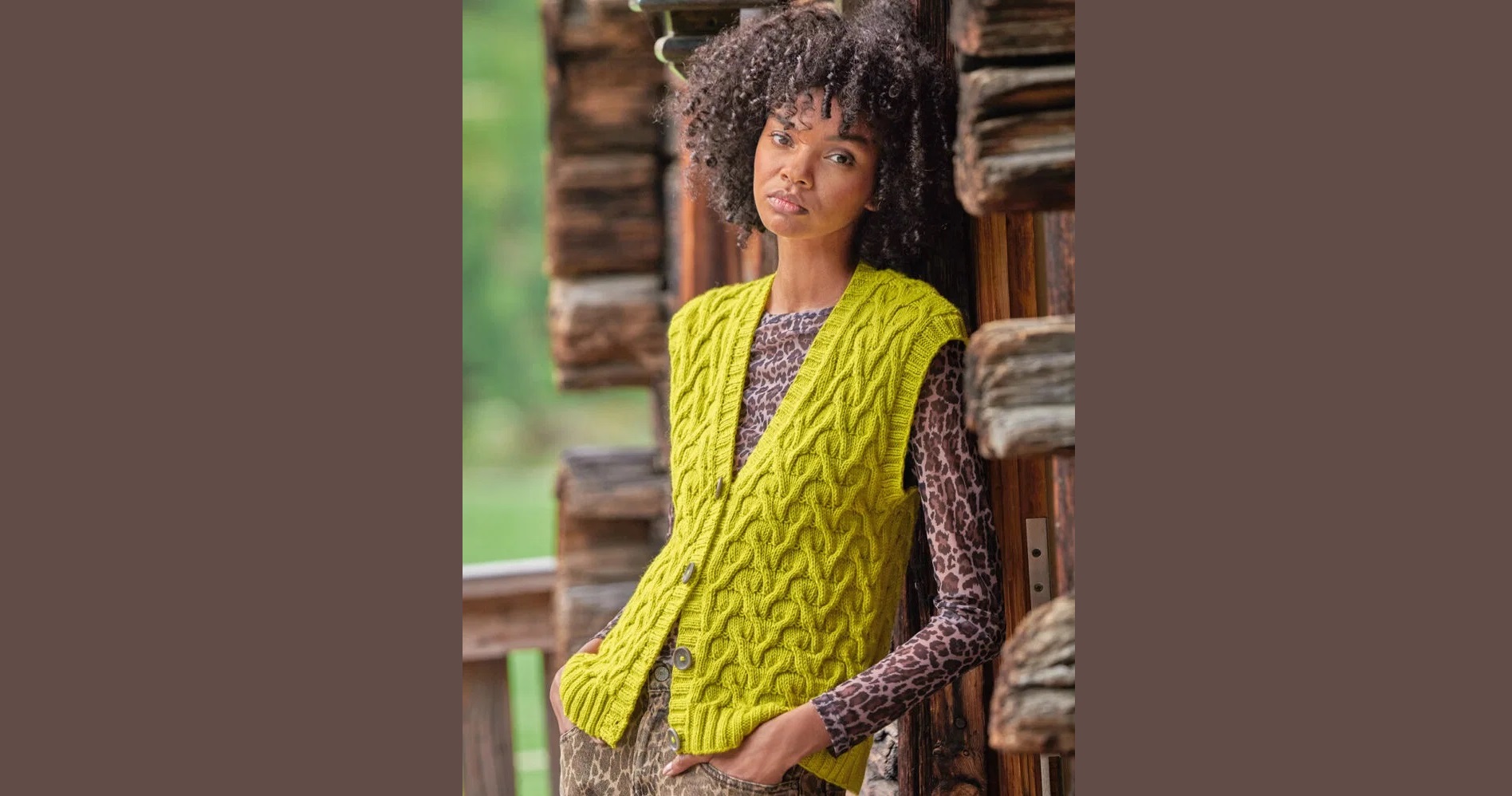 Причудливые переплетения, напоминающие пчелиные соты, делают вязаное полотно почти трехмерным. Жилет обрамлен классической резинкой, контрастные пуговицы завершают картину.