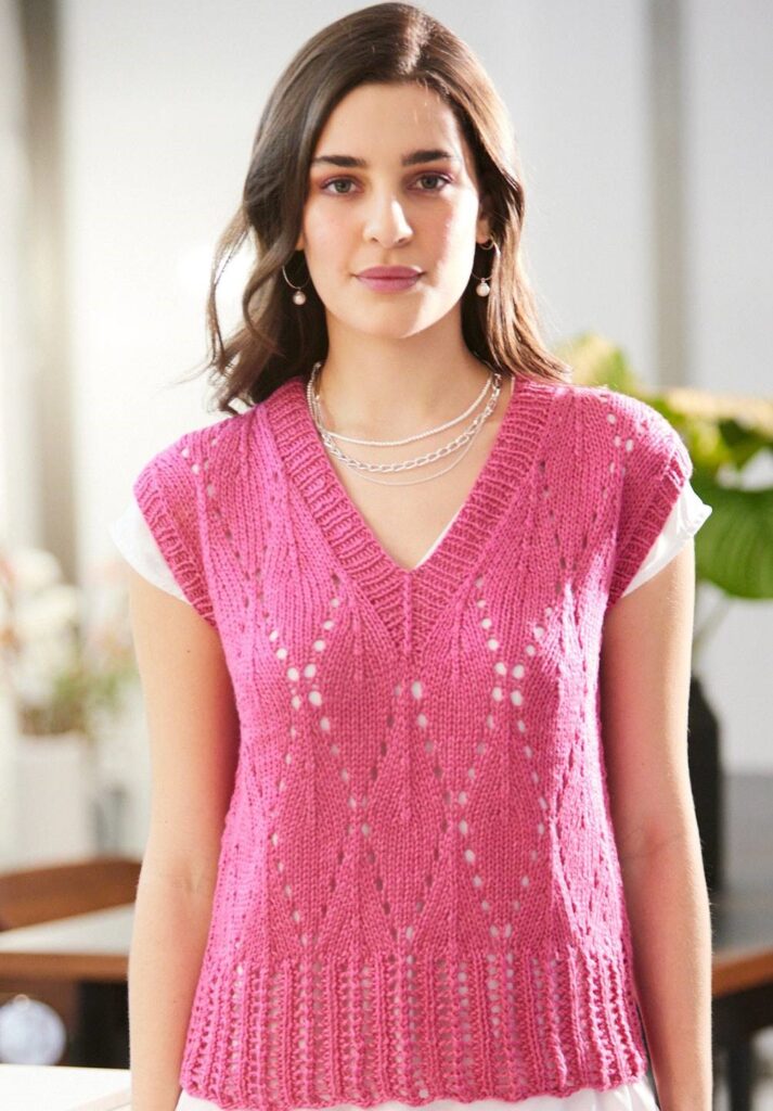 Расставляем акценты: ярко-розовый жилет с глубоким V-образным вырезом привлекает внимание, но все же не доминирует в образе. Особенностью этой модели, выполненной из смеси вискозы, хлопка и льна, является широкая полоса ажурной резинки по нижнему краю.
