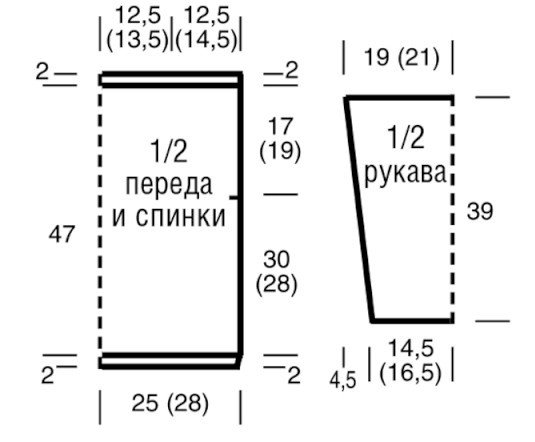 Выполнить плечевые швы на внешних по 12,5 (14,5) см. Вшить рукава, выполнить боковые швы и швы рукавов.