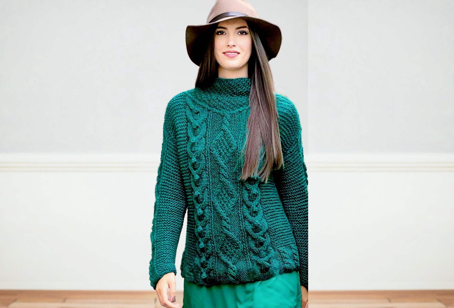 You will need: 450 (500) г изумрудной пряжи Schoeller+Stahl Meribel (50% шерсти, 40% полиакрила, 10% альпака, 90 м/50 г); прямые и круговые спицы № 7.