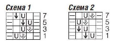 Вязать по схеме 1 или 2 соответственно. На схеме даны только лицевые ряды; в изнаночных рядах петли провязывать по рисунку, накиды провязывать изнаночными. Постоянно повторять 1-8-й р.