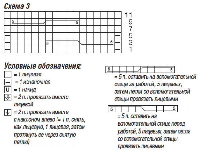 Вязать по схеме 3. На ней даны только лицевые ряды; в изнаночных рядах петли провязывать по рисунку. Постоянно повторять 1-12-й р.