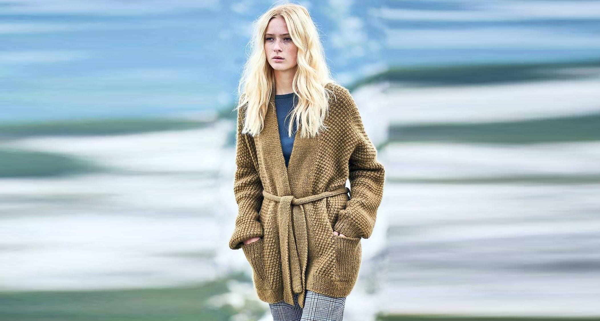 Кардиган с карманами, поясом и широкими гладкими планками вдоль бортов связан спицами пластичным структурным узором из овечьей шерсти с добавлением кашемира цвета нуги.