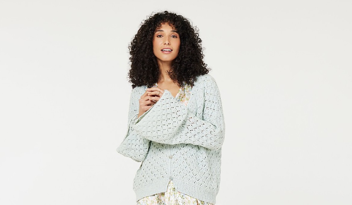 Укороченный кардиган оверсайз с длинными расклешенными рукавами и с глубоким V-образным вырезом, связан ажурным узором из мериносовой шерсти, хлопка и полиамида.