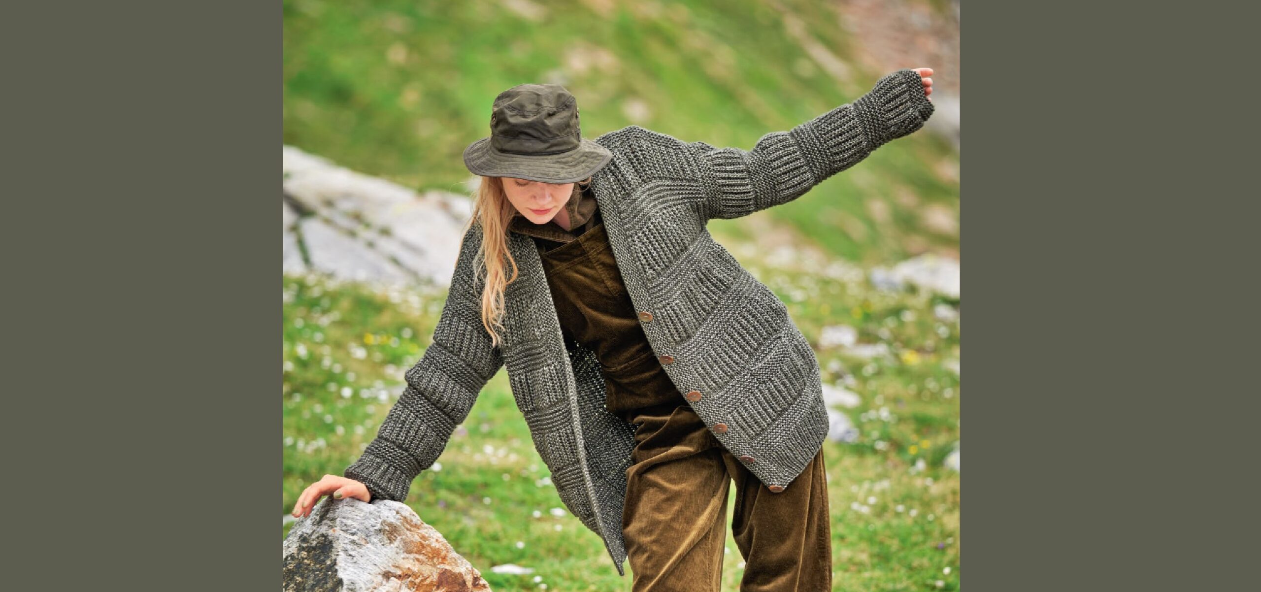 You will need: пряжа LANA GROSSA “Lucida” (58% овечьей шерсти, 42% вискозы; 100 м/50 г) — 600 (650) 700 г серо-зеленой Lodengrün (Fb 02); спицы № 4,5 и 6; круговые спицы № 5; 6 пуговиц диаметром по 36 мм.