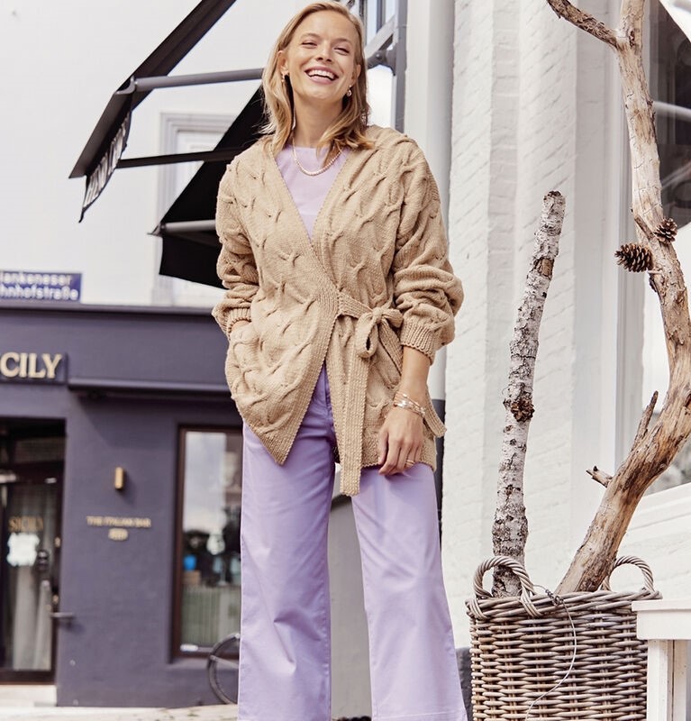 Изысканный характер кардигана заключается не только в роскошной шерстяной пряже с шелком и кашемиром или в сплошном узоре из стилизованных «кос». Изюминку добавляют длинные завязки на талии. При этом модель поистине универсальна и будет сопровождать вас повсюду.