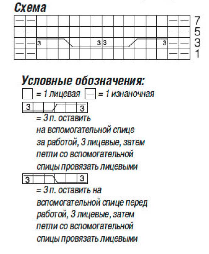 Узор 3: «коса» (на 16 п.) = вязать согласно схеме. На ней даны только лицевые ряды. В изнаночных рядах петли провязывать по рисунку.