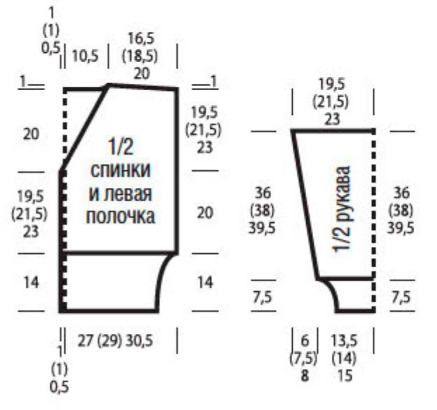 Knitting density: узор 2 — 23 п. х 53,5 р. = 10 х 10 см; планка — 20 п. = 4 см.