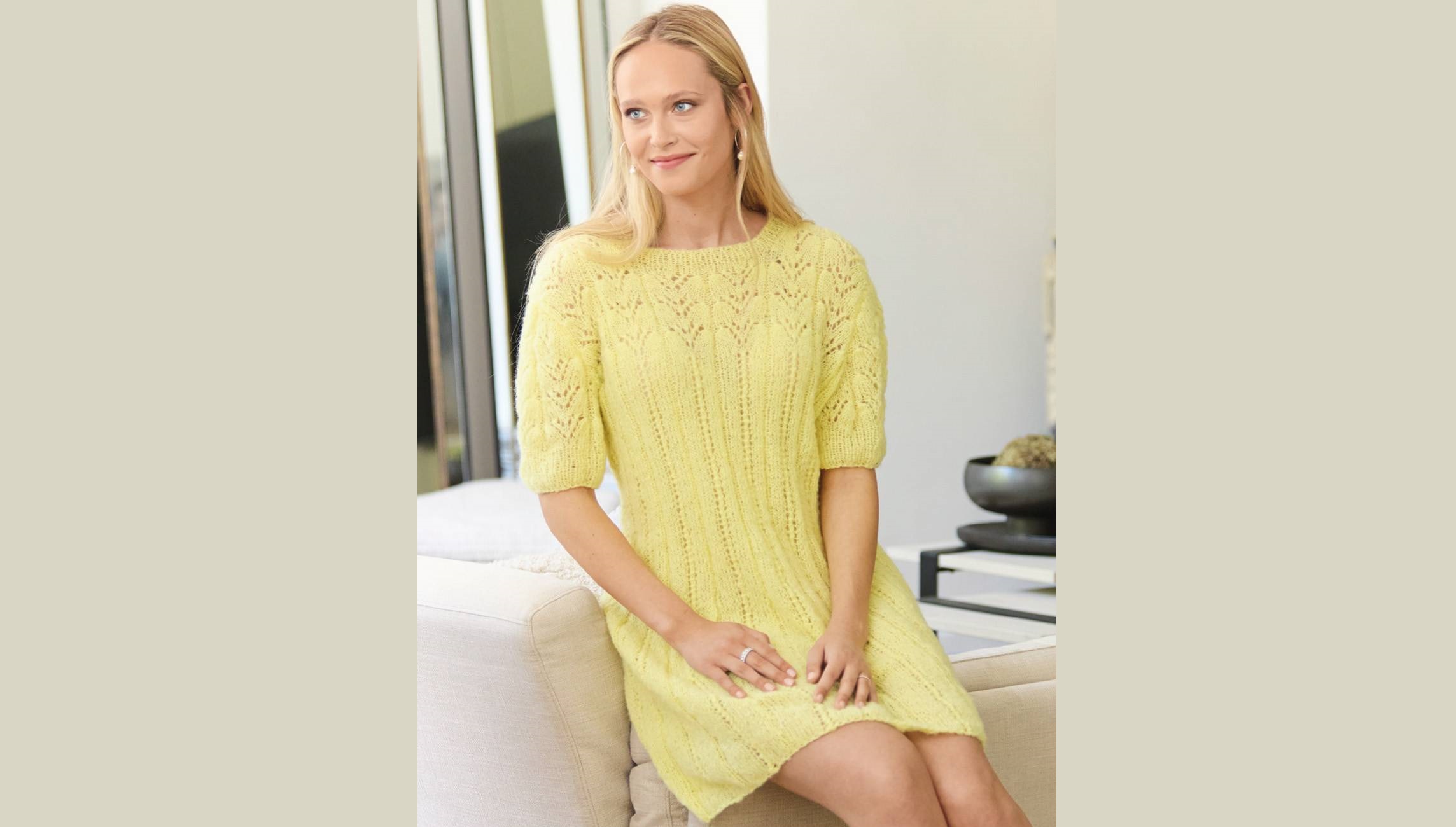 Короткое платье из смесовой пряжи с мохером кажется невесомым, словно облачко, и не добавл: объема. Женственны! расклешенный силуэт, комбинация ажурной резинки и Декоративного мотива, свежий лимонно-желтый оттенок — все здесь прекрасно.
