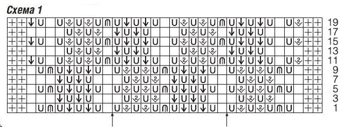 Pattern 1: узор из ромбов (число петель кратно 12 + 5 + 2 двойные кромочные) вязать согл. схеме 1. На ней даны только лицевые ряды; в изнаночных рядах все петли и накиды провязывать изнаночными. Начать с петель перед правой стрелкой, постоянно повторять раппорт из 12 п. между стрелками и закончить петлями после левой стрелки. Постоянно повторять 1-20-й р.
