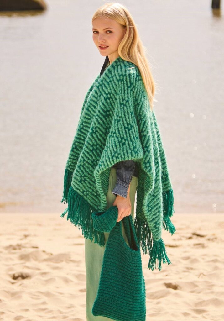 Для пончо, впечатляющего узором из снятых петель, используются два вида смесовой пряжи: ворсистая с мохером и обычная гладкая. Нижние края украшены длинной бахромой.