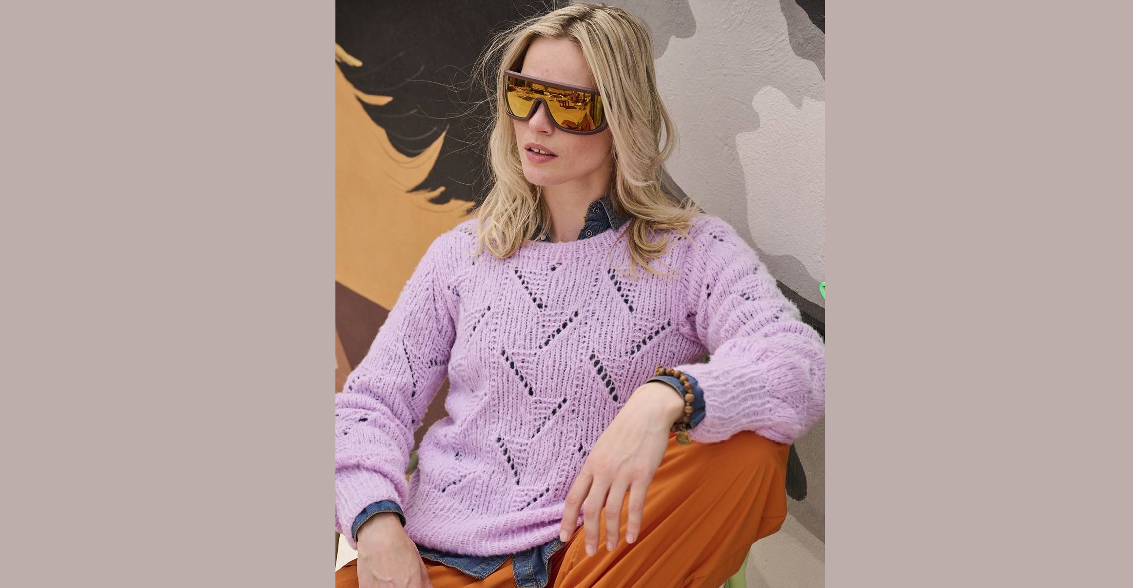 Эта модель легко адаптируется к любым трендам. Здесь мы использовали слегка вспушенную нить из натуральной шерсти с долей полиамида — получилось красивое полотно свежего лавандового оттенка с ажурными диагональными полосками.