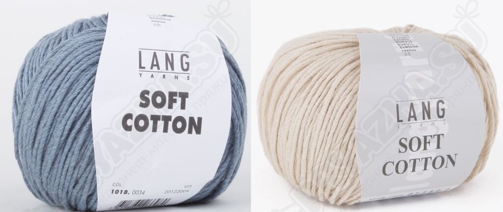 You will need: пряжа LANGYARNS “Soft Cotton” (100% хлопка; 120 м/50 г) — 250 (300) 350 г джинсово-синей и 200 (250) 250 г бежевой; спицы № 3,5 и 4; крючок № 3,5.