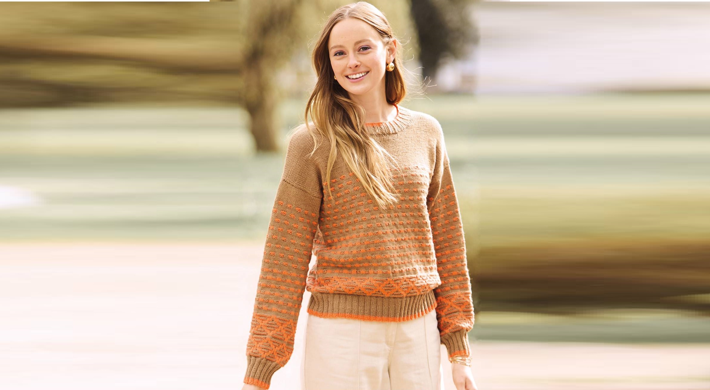 Для бейки горловины коричневой нитью на круговые спицы набрать по краю горловины 120 (128) 136 п. и связать 14 круг. р. узором 1, при этом через 10 круг. р. от набора петель продолжить работу оранжевой нитью.