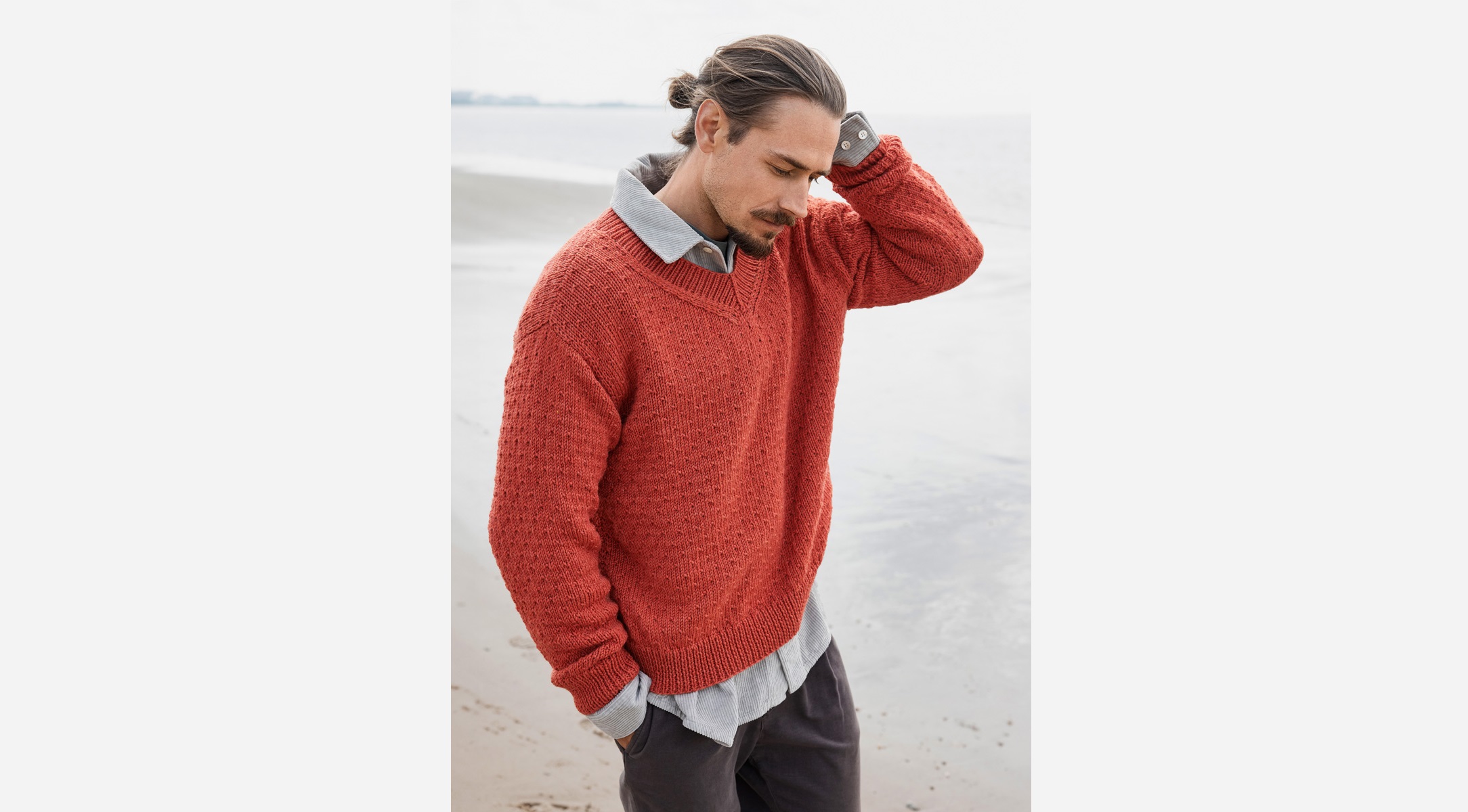 Materials: Lana Grossa Bingo Mélange (100% шерсть, метраж 80 м/50 г), 850 (900 – 950) г красно-меланж (цвет № 1031); прямые спицы № 3,5 и 5,5, а также круговые спицы № 3,5.