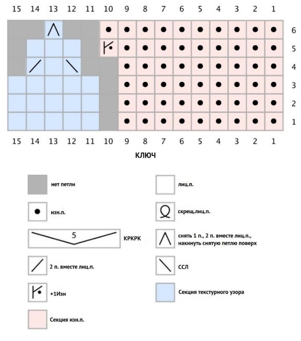 Круг. р. 6: 4 изн.п. KPKPK, 4 изн.п. снять 1 п., 2 п. вместе лиц.п., накинуть снятую петлю поверх. Повторять от * до конца круг.р.