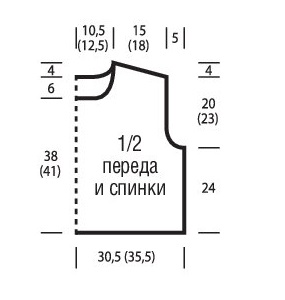 Вязать, как спинку, но для более глубокой горловины уже через 38 см = 114 р. (41 см = 124 р.) от начального ряда закрыть средние 12 (18) п. и обе стороны закончить раздельно.