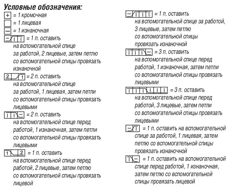 Узор 4. Узор из «кос» (число петель кратно 20 + 2 кромочные). Вязать по схеме. На ней дан 1-й изнаночный ряд и затем только лицевые ряды; в последующих изнаночных рядах петли провязывать по рисунку. Начать с петель перед правой стрелкой, постоянно повторять раппорт из 20 п. между стрелками и закончить петлями после левой стрелки. Выполнить 1 раз 1-7-й р., затем выполнить еще 2 раза 2-7-й р., далее выполнить 1 раз 20-59-й р. и постоянно повторять 36-59-й р.