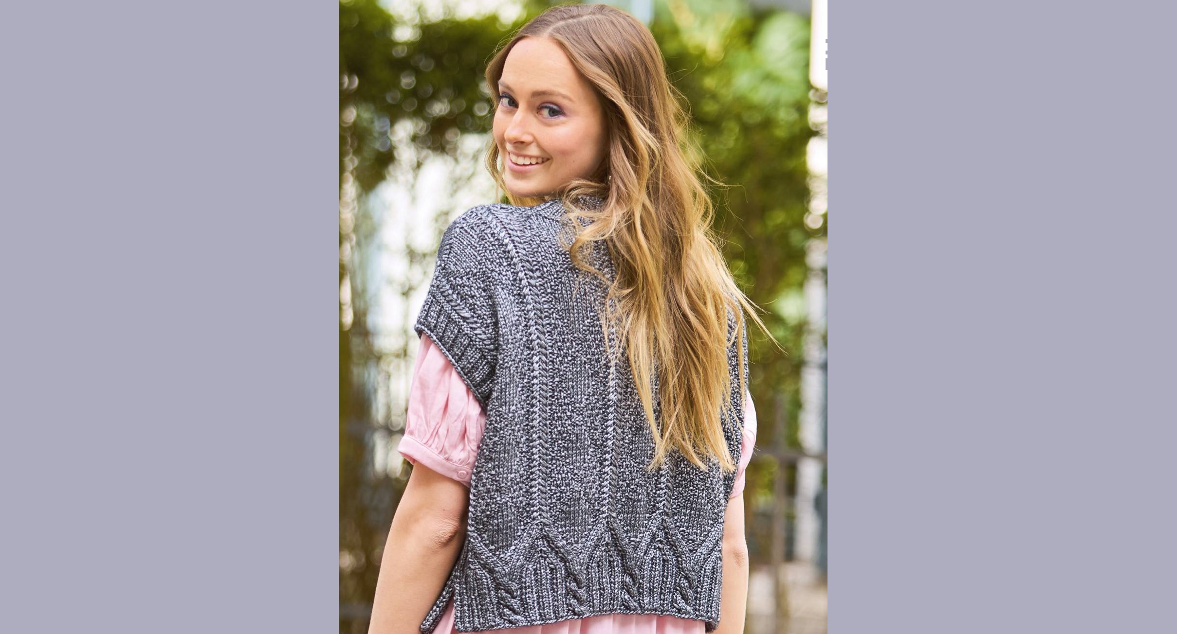 Короткие просторные жилеты снова в тренде, и эта вязаная модель не исключение. Ее можно стилизовать любым способом, но в то же время чудесный рельефный узор из «кос» и слегка блестящая пряжа добавят в образ изысканную нотку.