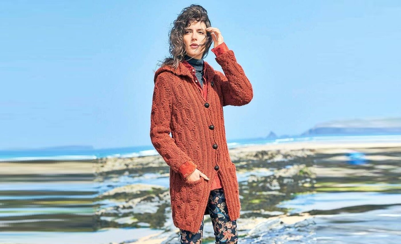 Ему все по плечу: удлиненный жакет узкого покроя с капюшоном, вывязанными карманами и деревянными пуговицами цвета состаренной латуни пригодится тем, кто жаждет приключений.