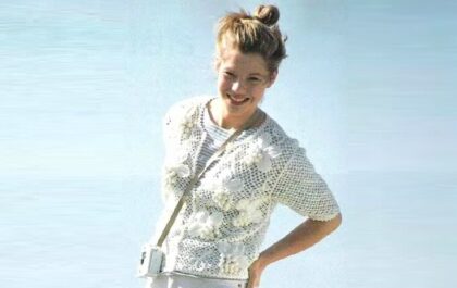 Summer dress of a fitted silhouette, with a deep neckline and narrow sleeves, slightly flaring at the bottom, is knitted with a lace pattern, smoothly transitioning into wave-like structures at the top and on the sleeves, made of cotton with Kashmir wool.