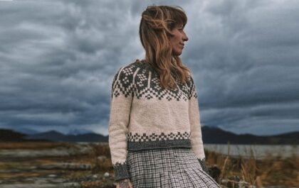 From a distance, the first thing that catches your eye is the round yoke with wide “braids.” Upon closer inspection, you notice the fluffy melange yarn in gray-blue tones
