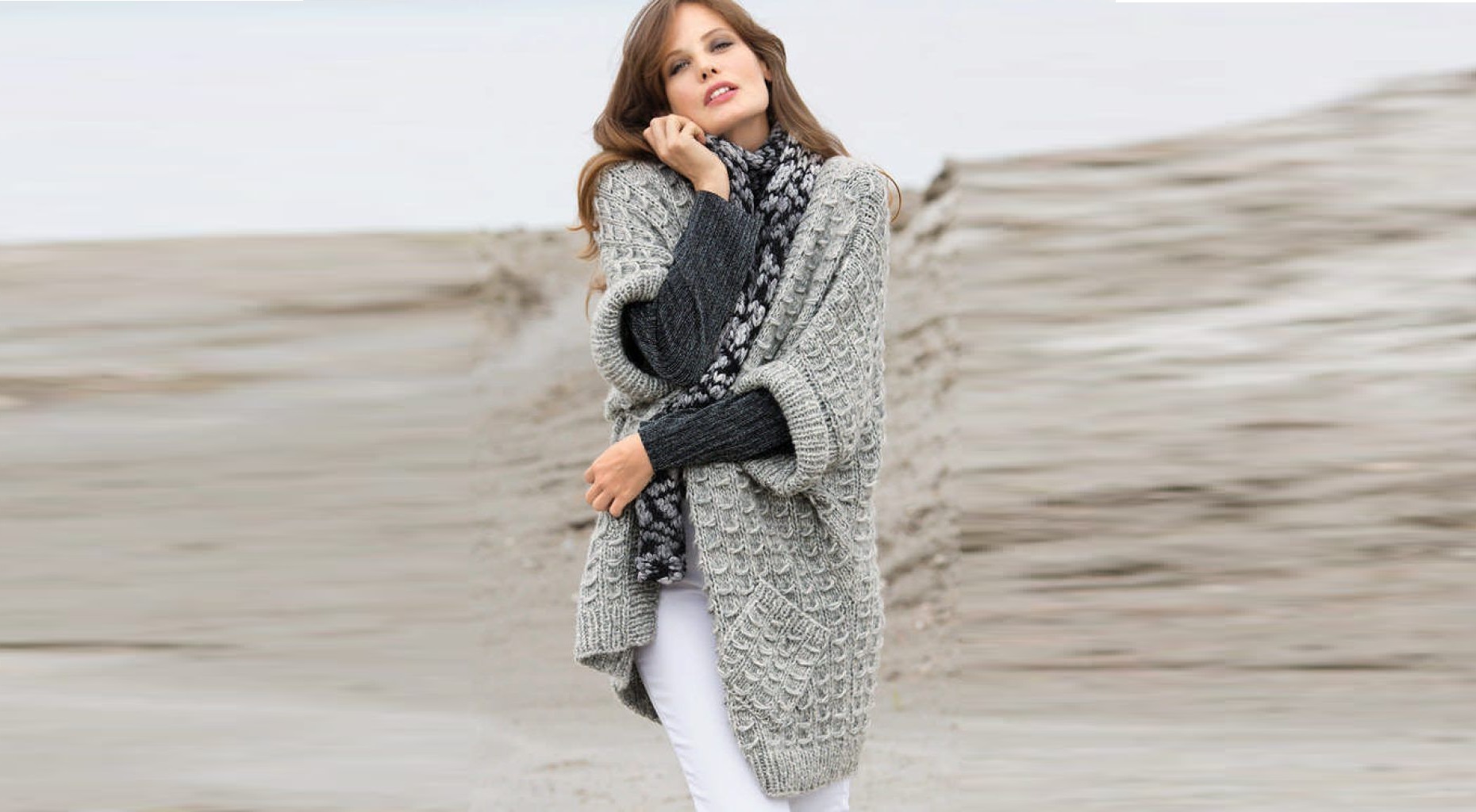 Безразмерный жакет с накладными карманами дополнен «леопардовым» шарфом из фасонной пряжи — чудесный ансамбль для прохладных дней.
