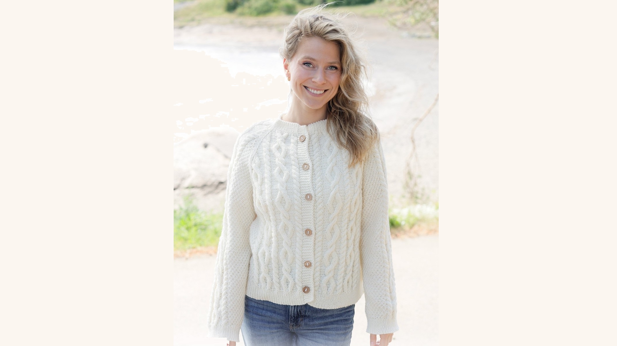 Жакет реглан с узором «Косы», большим жемчужным узором и отделкой планкой из полого шнура, связанный сверху вниз из пряжи DROPS Karisma или DROPS Lima