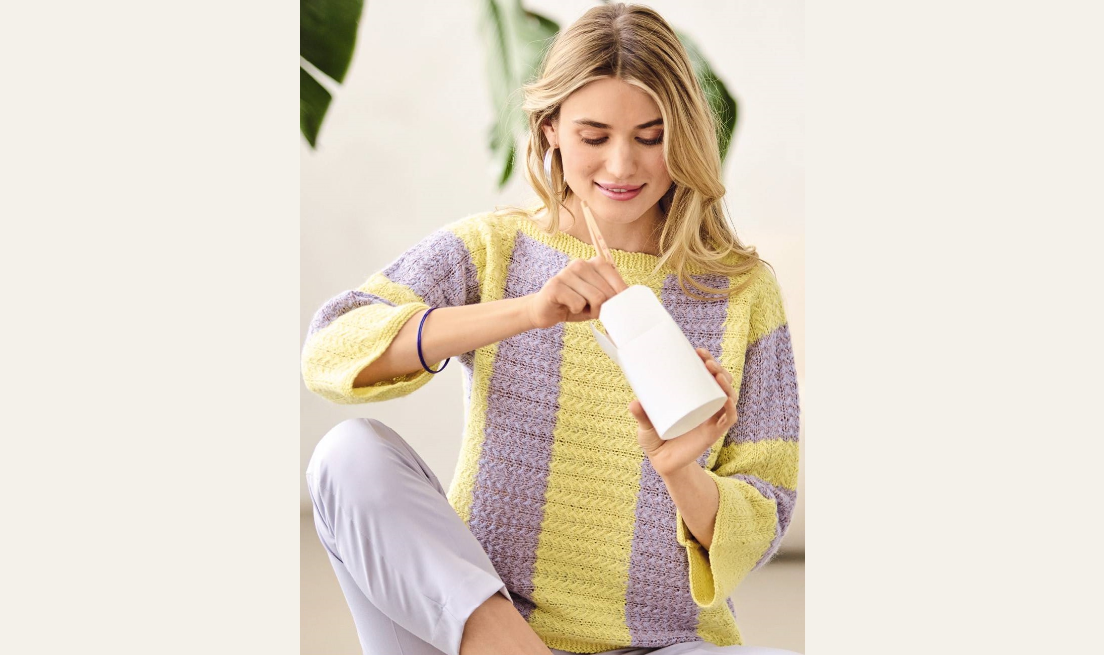 Удачный союз прямых линий и фактурного узора, воздушного хлопка и пушистого мохера -все это вы найдете в нашем пуловере, связанном поперек единым полотном.