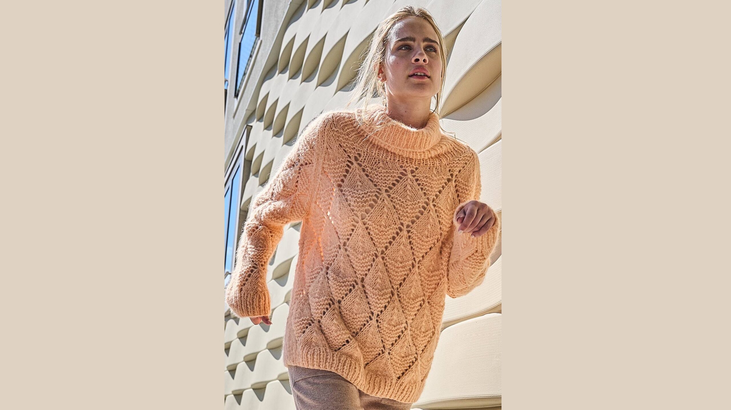 Пряжа из смеси альпаки нежного абрикосового цвета, используемая в этом повседневном свитере-реглан, невероятно пушистая и соответствует модному тренду на уют. Она также прекрасно подчеркивает все узоры.