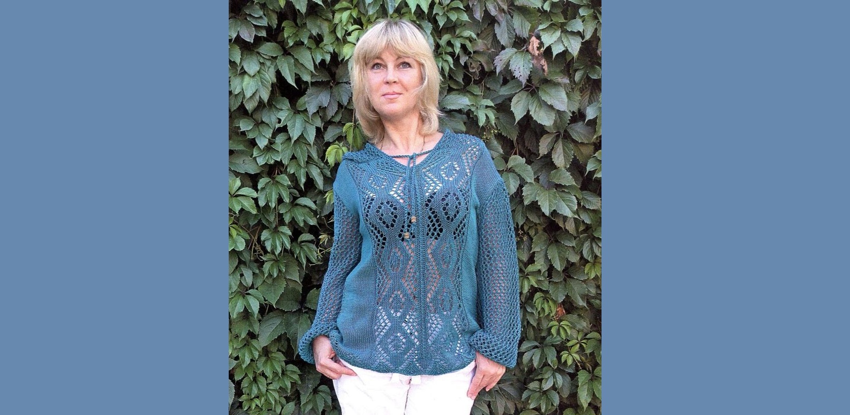 Красивый, легкий пуловер с капюшоном для летних прогулок.  По внешнему виду, пуловер очень похож на ветровку благодаря чему, он очень хорошо сочетается с брюками. При вязании были использованы несколько видов узоров. Основной узор расположен в виде двух вертикальных полос по центру полочки.  Рукава и капюшон связаны более мелким узором. Вырез горловины стягивается небольшими завязками.