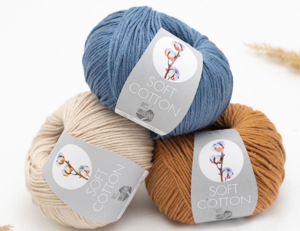 Вам потребуется: пряжа LANA GROSSA”Soft Cotton” (70 % хлопка, 30 % полиакрила; 140 м/50 г) — 400 (450) г бежевой (Farbe 01051); спицы № 3,5; крючок для вязания № 3,5.
