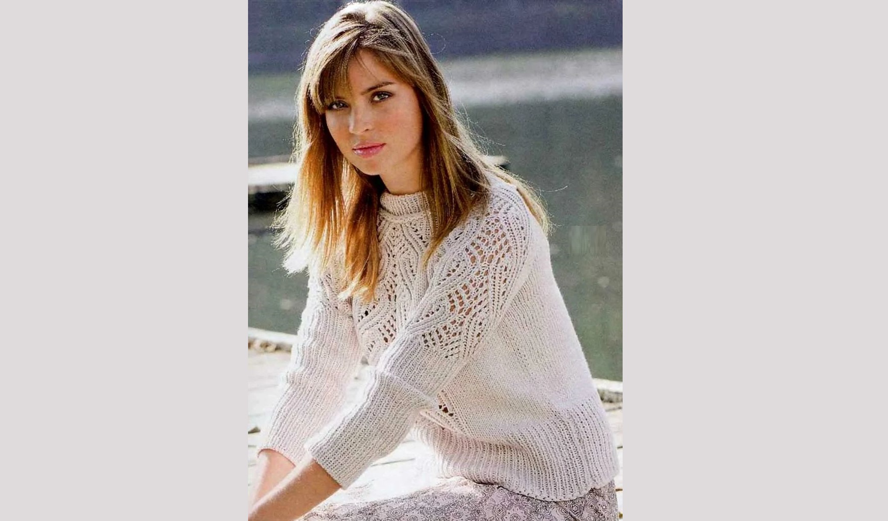 Основой для пуловера с высокими планками в резинку и с великолепными ажурными полосами является шероховатая на ощупь пряжа из био-хлопка.