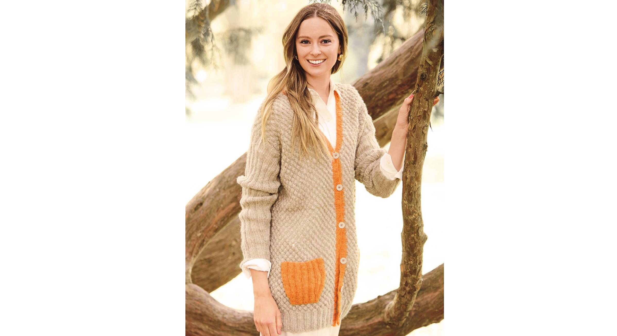 Кардиган из натуральной шерсти альпаки соединяет чистоту линий с высоким уровнем комфорта. Спинка и рукава вяжутся резинкой, а полочки -узором из «розочек». На этом контрасты не кончаются: яркие накладные карманы и планка застежки создают модные акценты.